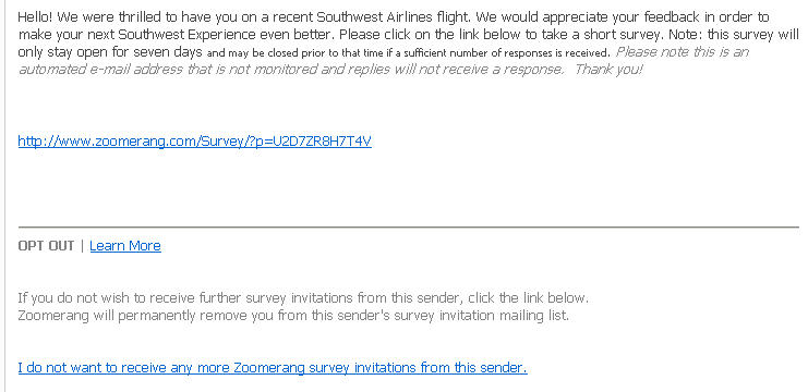 The morning after my flight I received a survey asking how my Southwest Airlines experience was. The survey was short, to-the-point and delivered in rich text so it would be easy to read on mobile devices (and for those who do not have images turned on). The survey subject line was “Survey: Your Most Recent Southwest Airlines Flight.