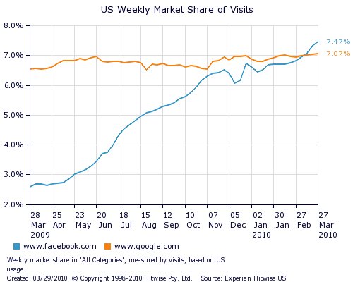 As recently reported on the blog of our sister company Experian Hitwise, Facebook surpassed Google in the U.S. to become the most visited website during the week ending March 13, 2010. The market share of visits to Facebook.com increased 185% during that week as compared to the same week in 2009, while visits to Google.com increased 9% during the same time frame. Together Facebook.com and Google.com accounted for 14% of all US Internet visits during the week ending March 13.