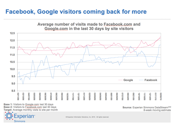 Experian Simmons DataStream found that while visitors to both Facebook and Google are making more frequent visits to each site in a given month today than they were two years prior, Facebook has seen its visitors’ average montly visit count rise at a much faster clip. As of February 8, 2010, Facebook visitors made an average of 11.7 visits to the site in the previous month, an increase of 21 percent compared to February 11, 2008 when Facebookers made only 9.6 visits to Facebook.com a month. During the same time, Google experienced only an 8 percent increase in the average number of visits its visitors made to Google.com each month. As of February 8, 2010, Google visitors made an average of 12.1 visits to Google.com in the previous month versus an average of 11.3 visits that Googlers made to the site in the month ending February 11, 2008. With momentum on its side, Facebook may soon exceed Google in both traffic and average monthly visits.