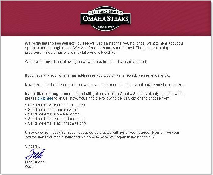 Since the unsubscribe email was deployed right after I clicked the unsubscribe button, I did not feel like my request was being taken advantage of. It also helped that the the email from Omaha Steaks used very clear, heartfelt and thoughtful language in their message. They did a great job with this post opt-out email all around, from the subject line (“We removed your email address…”) to the signed note from the owner.