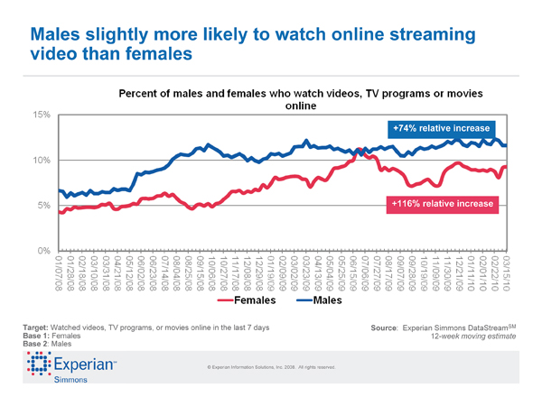 Males are more likely to watch online streaming video than females, but females are increasingly involved in this activity as well, with 12% of males and 9% of females watching streaming online video as of March 15, 2010.