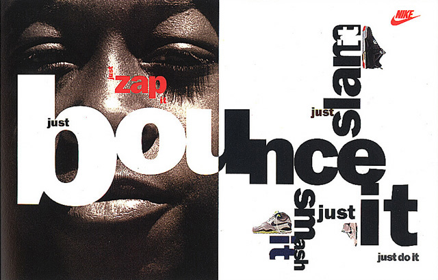 Taking a step back and looking at these designs through the lens of history, they remind me quite a bit of popular print advertising from the 1990′s, known commonly as “grunge” style. Grunge was not just associated with music and fashion in the 90′s, but was also made popular by designers such as David Carson. Even companies as straight-laced as Nike and Coca-Cola experimented with grunge visuals during the 1990′s.