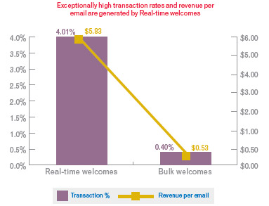 It should come as no surprise that real-time triggered emails outperform bulk welcome messages that operate on some sort of delay. In today’s instant-access consumer culture, those who reach out to you are looking for instant response. Clearly, real-time triggered welcome messages fulfill this need, earning over 10x higher transaction rates and 11x revenue per email than delayed bulk welcome messages.