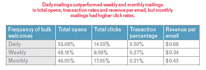 As it turns out, if you can’t get that first welcome message out the door on the same day as the initial registration, you might want to wait several weeks before sending out the first email. Surprisingly, the report shows that monthly welcome mailings actually outperform weekly welcomes when it comes to total clicks and revenue per email. In the area of total clicks, monthly mailings even outperform daily bulk mailings.