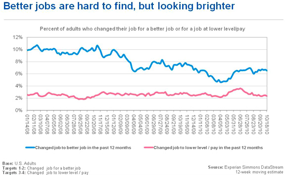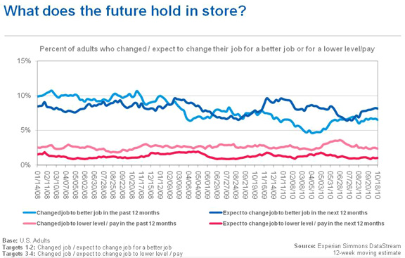 Specifically, as of October 18, 2010, Experian Simmons found that 6.5% of U.S. adults had changed jobs for something better in the previous year. That’s a relative decline of 34% compared to January 14, 2008, when 9.9% of Americans said they had changed jobs for the better. Meantime, the share of Americans who changed jobs for something at either a lower level or with lower pay remained relatively stable. (As of October 18, 2010, 2.4% of Americans said that in the last year they took a job at a lower level or with lower pay than the one they had before.)
