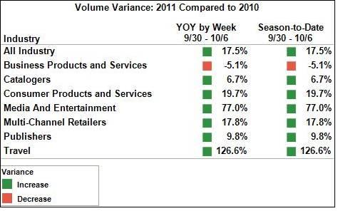Projections for this holiday season called for a 15%-20% increase in email overall volume, according to my last post. I’m happy to report that – so far, those projections are right on the money! Experian CheetahMail client data indicates that this first week, September 30 – October 6, hit that mark exactly with a 17.5% increase in all industry email volume.