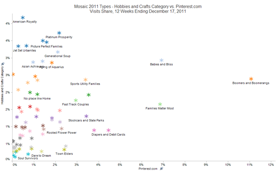 In fact, nine of the top ten over-indexed states for Pinterest visitors also over-index for the Hobbies and Crafts category (versus the online population) which is expected given the abundance of crafts content on the website. When comparing the Mosaic USA 2011 types that visit both Pinterest.com and Hobbies and Crafts websites during the 12 weeks ending December 17, 2011, the data shows that Boomers and Boomerangs are the group most likely to visit, particularly the Pinterest website (comprising over 10% of visits). This group of consumers is characterized as baby boomers and young adults who are heavy web users who spend time on house and garden, sports and fitness, and family-oriented websites. This information is useful to companies who wish to target their content to be “pinned” by Pinterest users.
