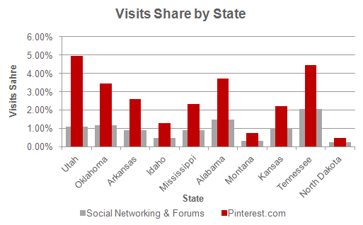 Pinterest content has something for everyone, but the site is dominated by images featuring home décor, crafts, fashion, and food. Not surprisingly, visitors to the site in the 12 rolling weeks ending December 17th skewed female (58%) and between the ages of 25 and 44 (59%). Pinterest and the Social Networking & Forums category both receive their highest share of visits from California and Texas. However, the Social Networking category as a whole over-indexes on share of visits from Northeastern states while Pinterest over-indexes on visits from the states in the Northwest and Southeast. This data indicates that Pinterest visitors have a different profile versus their counterparts visiting other social networking sites such as Facebook and YouTube.