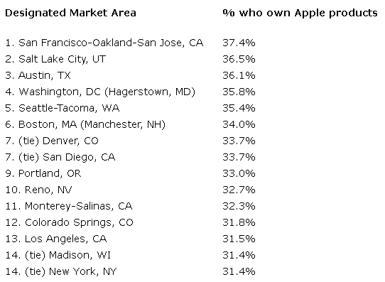 Unless you’re strictly a PC (and even if you are), you probably know that it’s Apple iPad HD day! So which corners of the country will be glued to the tech blogs all day to get up-to-the-second news on Apple’s latest gadget? To ponder a guess, Experian Simmons analyzed ownership of core Apple products in over 100 U.S. Designated Market Areas (DMAs) with adult populations over 500,000. Specifically, the analysis included the percent of local adults who own at least one of the following: iPhone, Mac computer or iPod. While national ownership of iPad tablets is currently available from Experian Simmons, local market estimates will not be released until May. That being said, evidence suggests that an analysis of local ownership of Apple’s other core products should provide us with a solid estimate of where Americans will be waiting with baited breath for iPad HD updates. In fact, according to our latest national estimates, 82% of iPad owners own at least one of the other three measured Apple products. The fifteen markets whose adult residents are most likely to own an iPhone, Mac computer or iPod are listed below.