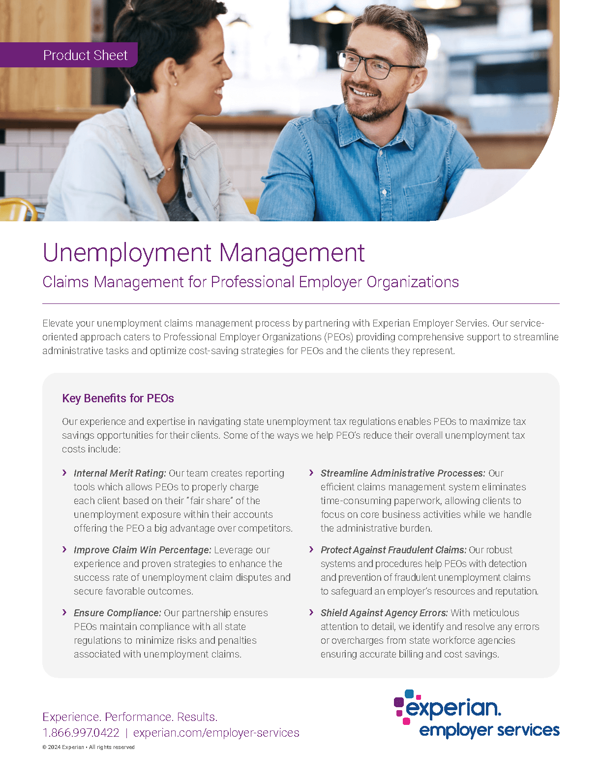 At Experian Employer Services, our unemployment management team can manage communications and represent your team. Contact us today to review our workforce management products and see how we can help with unemployment claims management.