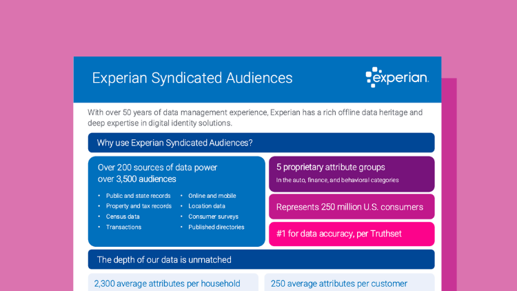 Interpret your Insights report with Experian’s analytics experts and prioritize the findings that create the greatest opportunity. Bring Experian data in-house with Enrichment to strengthen your customer data and pair custom audiences with messaging designed to drive action.
